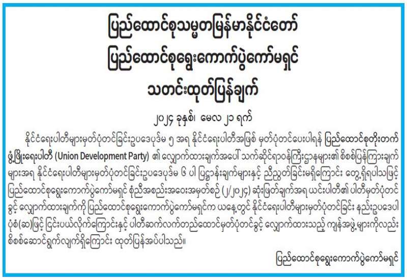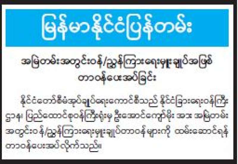 ပို့ဆောင်ရေးနှင့်ဆက်သွယ်ရေးဝန်ကြီးဌာန မြန်မာ့စာတိုက်လုပ်ငန်းမှ မြန်မာနိုင်ငံတစ်ဝန်းရှိ စာကြည့်တိုက်များ ဖွံ့ဖြိုးတိုးတက်ရေးနှင့် ပြည်သူများ စာဖတ်နှုန်းမြင့်တက်စေရန်ရည်ရွယ်၍ တစ်ဖက်တစ်လမ်းမှ ပါဝင်ဝန်ဆောင်မှုပေးသည့်အနေဖြင့် ပြန်ကြားရေးဝန်ကြီးဌာနမှ ဖွင့်လှစ်ထားသော လူထု အခြေပြုဗဟိုဌာန(စာကြည့်တိုက်)များသို့ စာအုပ်များ ပေးပို့လှူဒါန်းလိုပါက မြန်မာ့စာတိုက်လုပ်ငန်းရှိ စာတိုက်များတွင်(အခမဲ့)ပေးပို့နိုင်ပါကြောင်း ကြေညာအပ်ပါသည်။