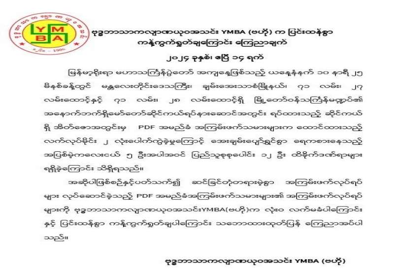 ဗုဒ္ဓဘာသာကလျာဏယုဝအသင်း YMBA (ဗဟို) က ပြင်းထန်စွာ ကန့်ကွက်ရှုတ်ချကြောင်း ကြေညာချက်