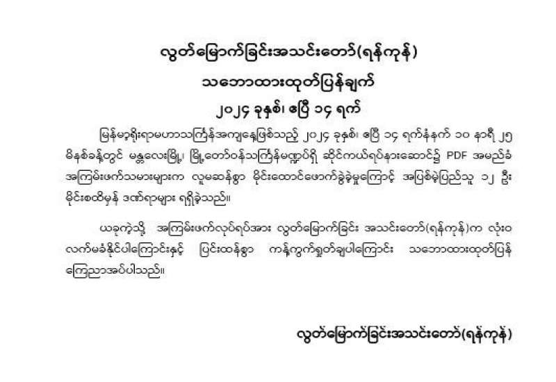 လွတ်မြောက်ခြင်းအသင်းတော် (ရန်ကုန်) သဘောထားထုတ်ပြန်ချက်