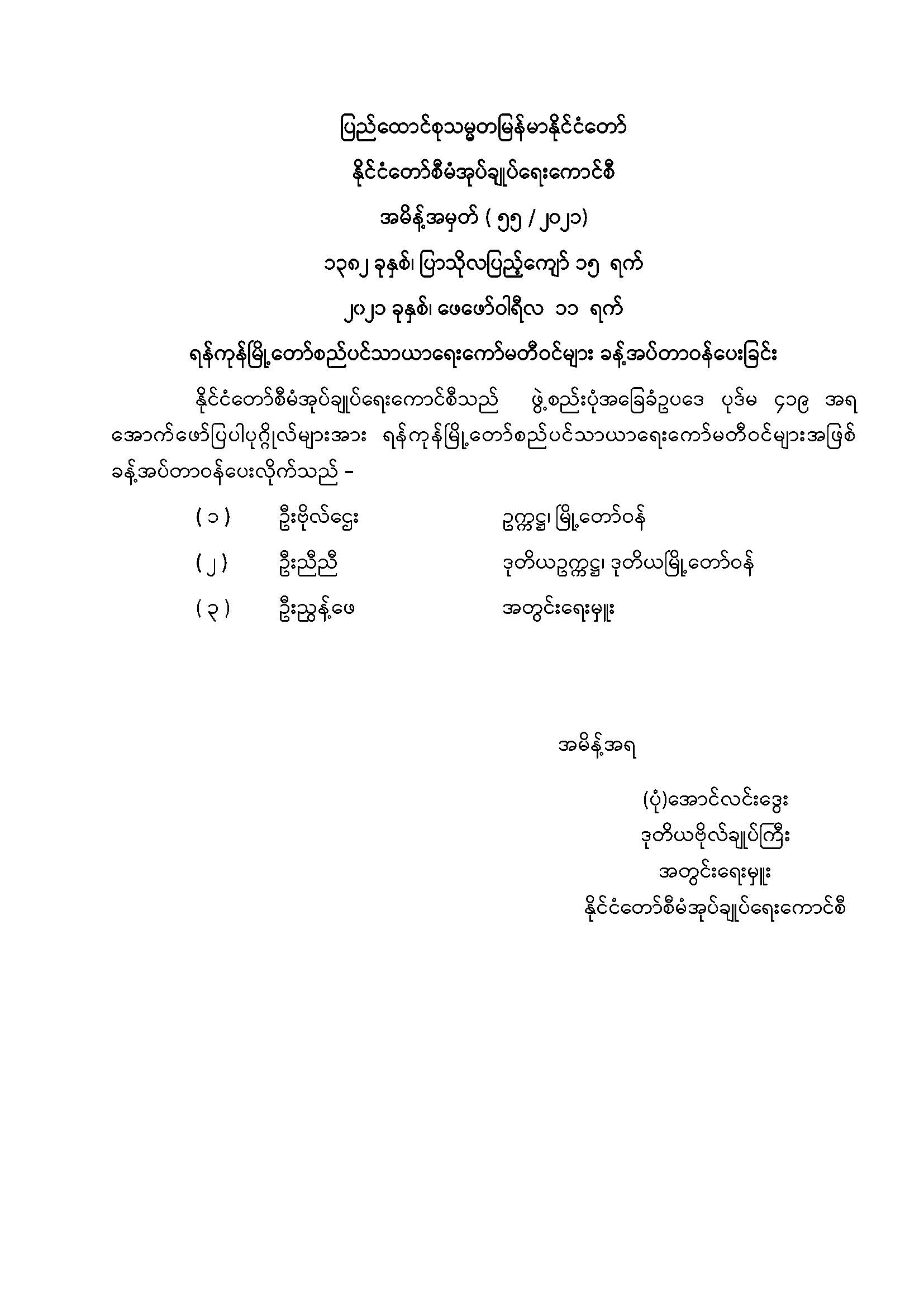 ရန်ကုန်မြို့တော်စည်ပင်သာယာရေးကော်မတီဝင်များ ခန့်အပ်တာဝန်ပေးခြင်း