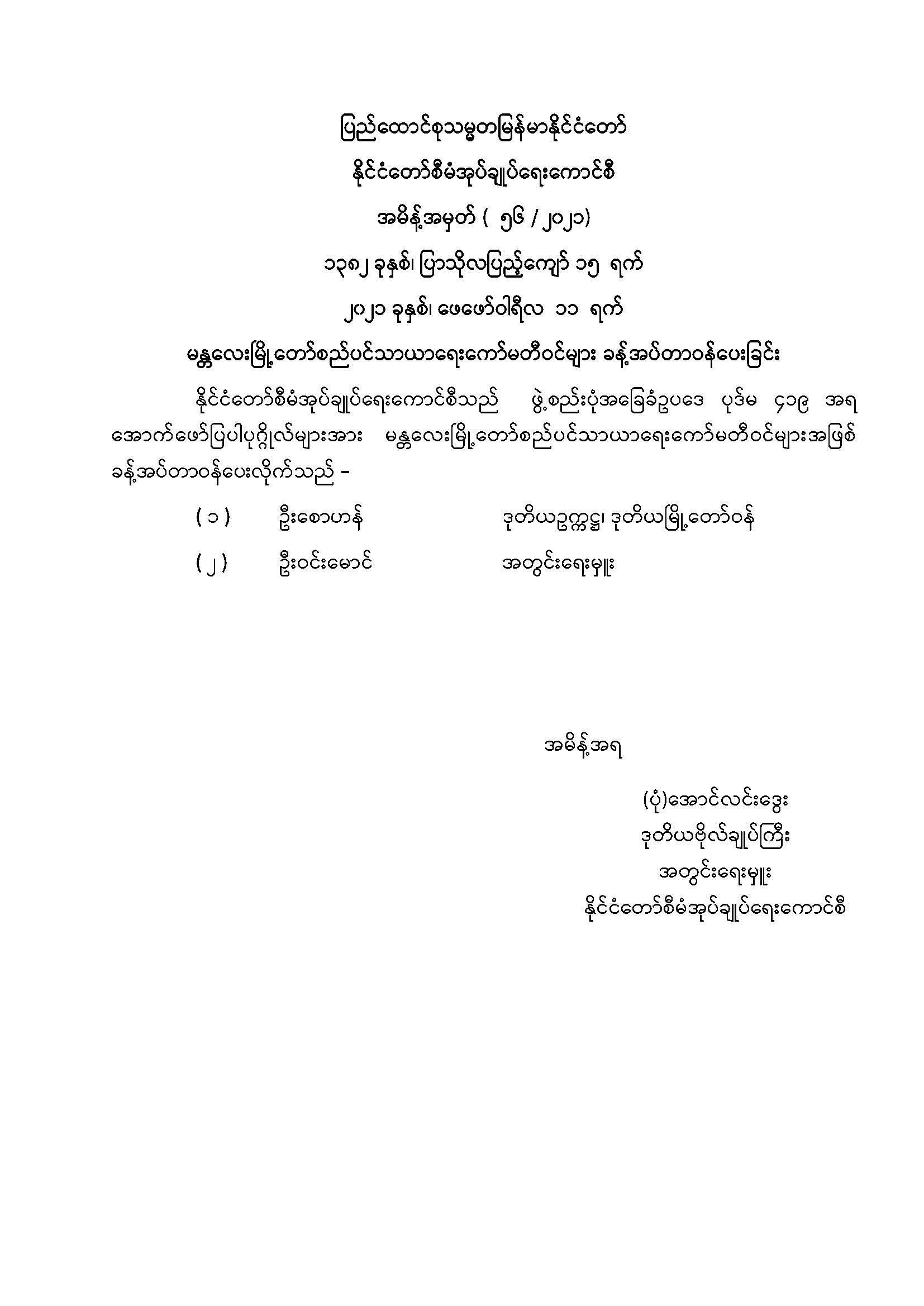 မန္တလေးမြို့တော်စည်ပင်သာယာရေးကော်မတီဝင်များ ခန့်အပ်တာဝန်ပေးခြင်း