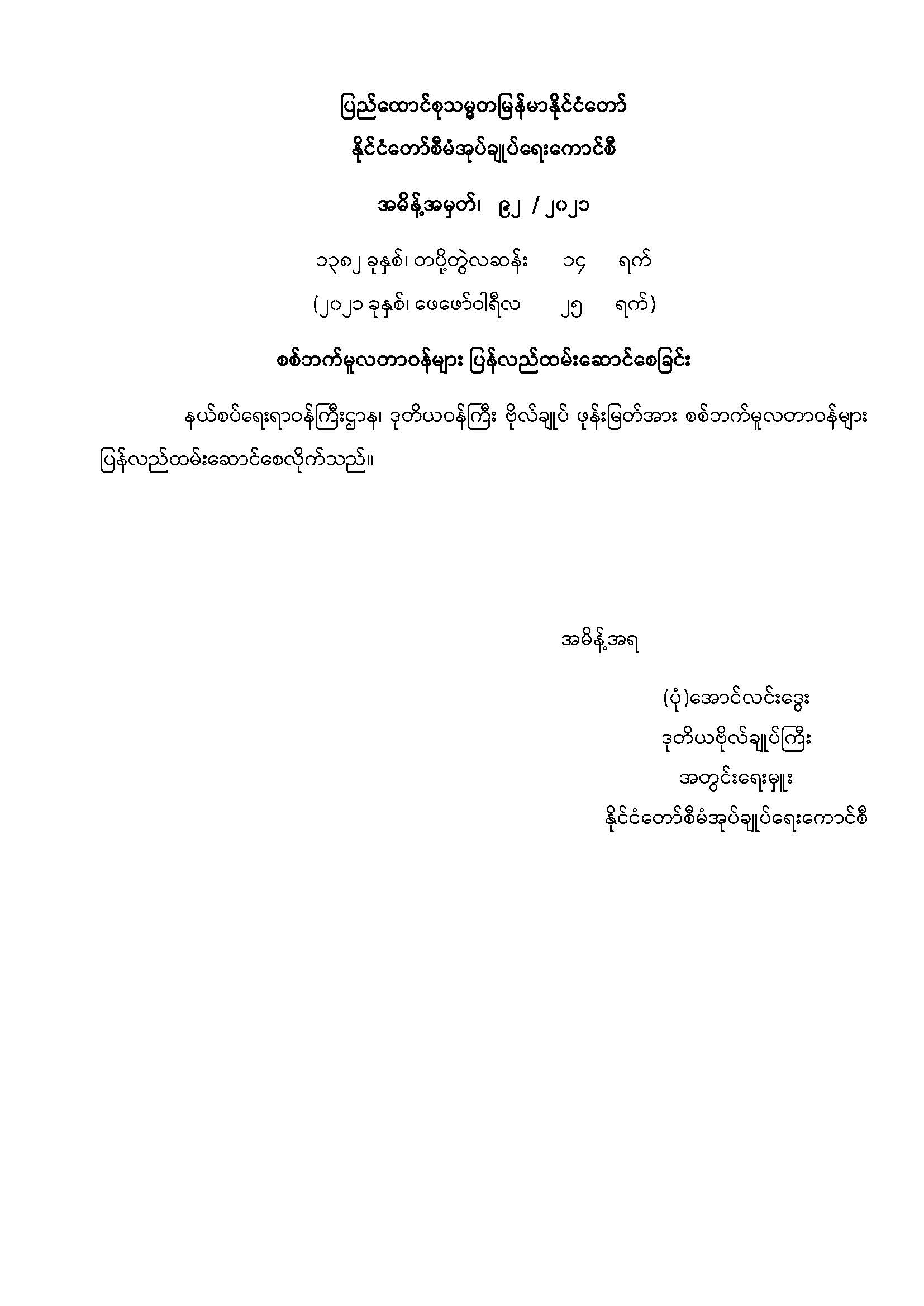 ပြည်ထောင်စုသမ္မတမြန်မာနိုင်ငံတော် နိုင်ငံတော်စီမံအုပ်ချုပ်ရေးကောင်စီ အမိန့်အမှတ်၊ ၉၂ / ၂၀၂၁ ၁၃၈၂ ခုနှစ်၊ တပို့တွဲလဆန်း ၁၄ ရက် (၂၀၂၁ ခုနှစ်၊ ဖေဖော်ဝါရီလ ၂၅ ရက်)