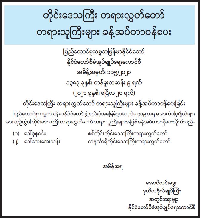 တိုင်းဒေသကြီး တရားလွှတ်တော် တရားသူကြီးများ ခန့်အပ်တာဝန်ပေး