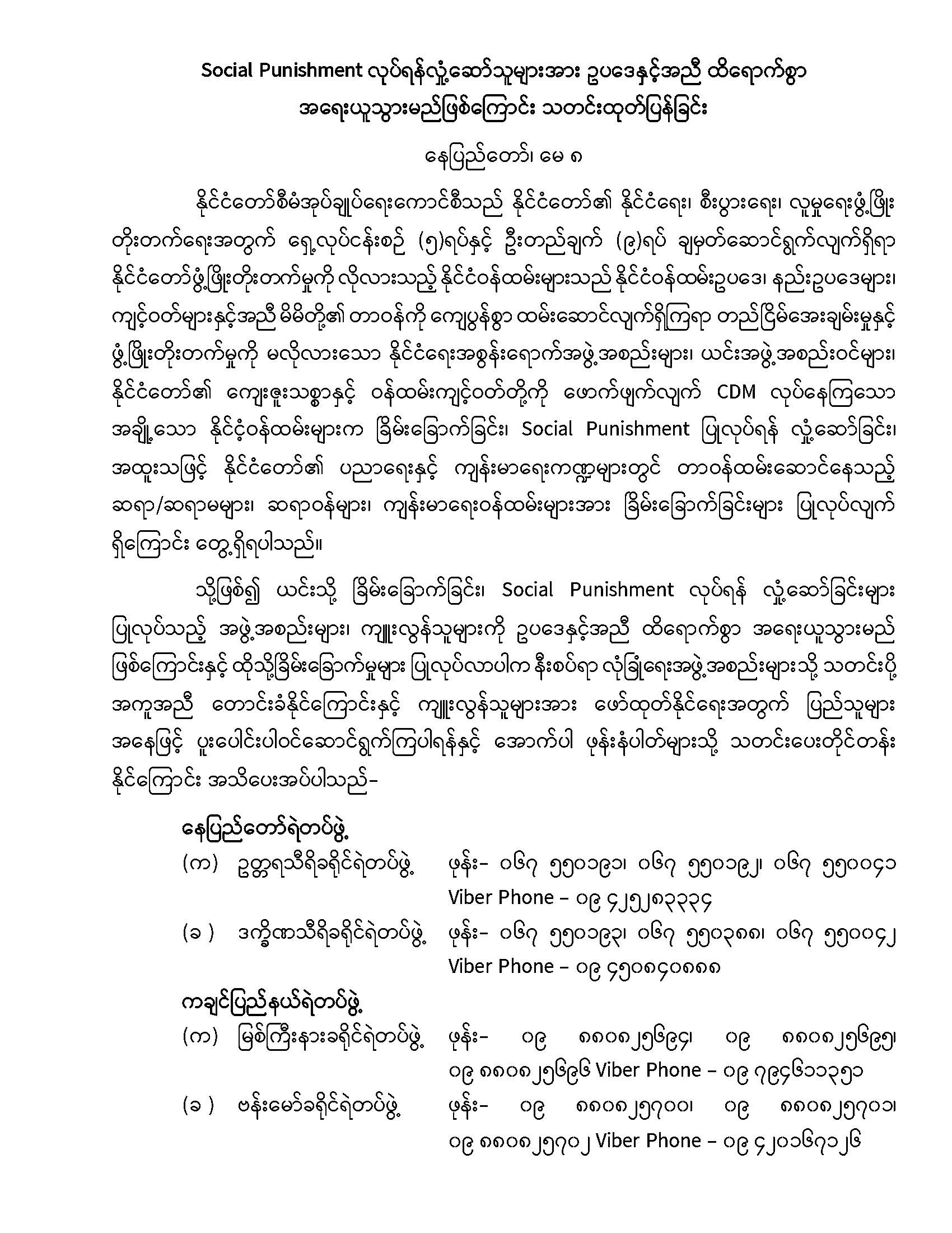 Social Punishment လုပ်ရန်လှုံ့ဆော်သူများအား ဥပဒေနှင့်အညီ ထိရောက်စွာ အရေးယူသွားမည်ဖြစ်ကြောင်း သတင်းထုတ်ပြန်ခြင်း 05/08/2021