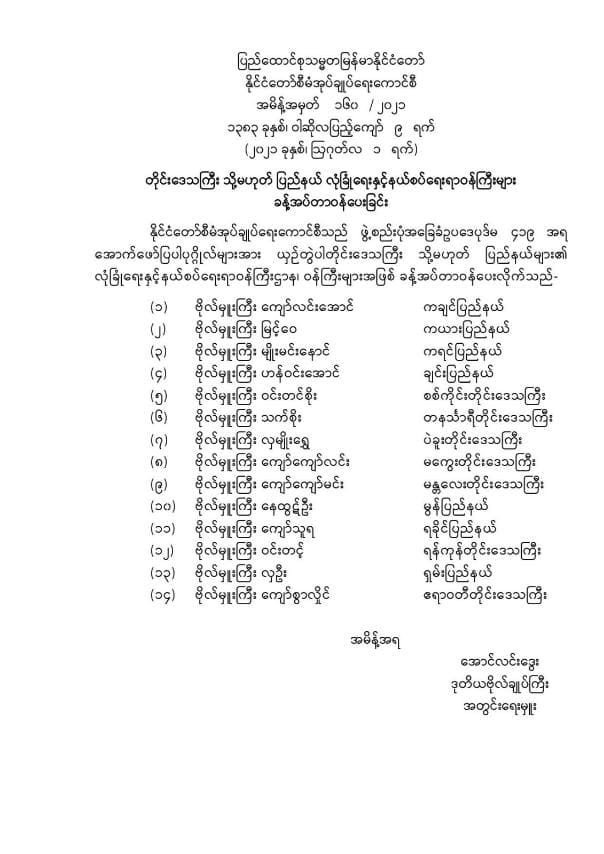 တိုင်းဒေသကြီး သို့မဟုတ် ပြည်နယ် လုံခြုံရေးနှင့်နယ်စပ်ရေးရာဝန်ကြီးများ ခန့်အပ်တာဝန်ပေးခြင်း 08/01/2021