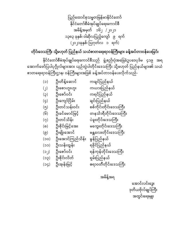 တိုင်းဒေသကြီး သို့မဟုတ် ပြည်နယ် သယံဇာတရေးရာဝန်ကြီးများ ခန့်အပ်တာဝန်ပေးခြင်း