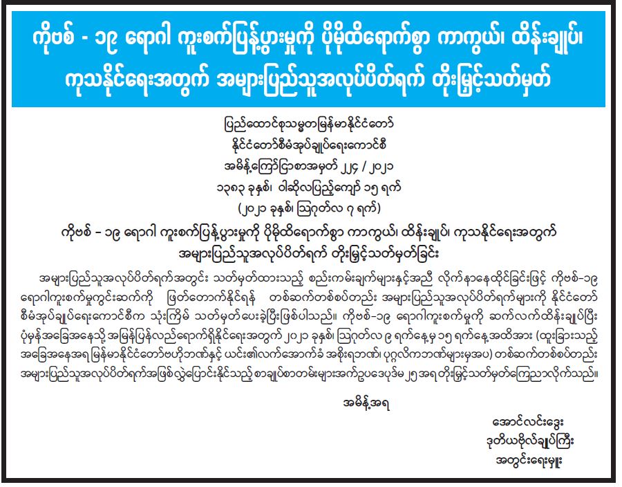 ကိုဗစ်-၁၉ ရောဂါ ကူးစက်ပြန့်ပွားမှုကို ပိုမိုထိရောက်စွာ ကာကွယ်၊ ထိန်းချုပ်၊ ကုသနိုင်ရေးအတွက် အများပြည်သူ အလုပ်ပိတ်ရက် တိုးမြှင့်သတ်မှတ် 08/08/2021