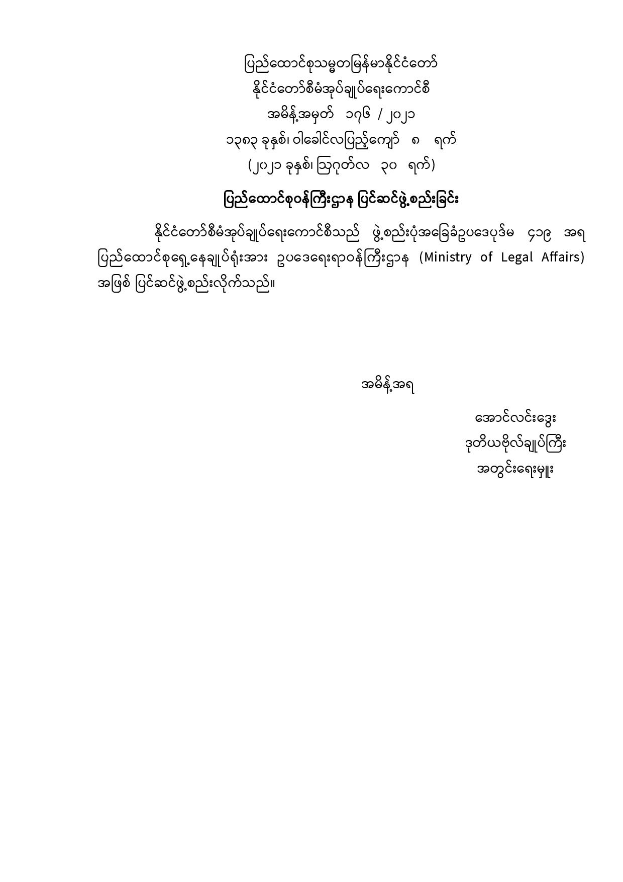 ပြည်ထောင်စုဝန်ကြီးဌာန ပြင်ဆင်ဖွဲ့စည်းခြင်း
