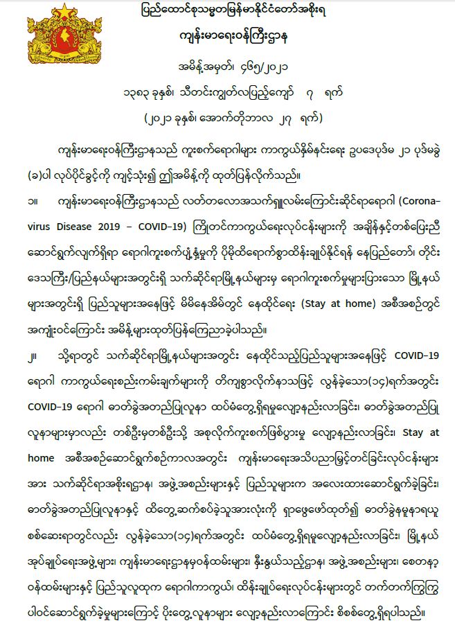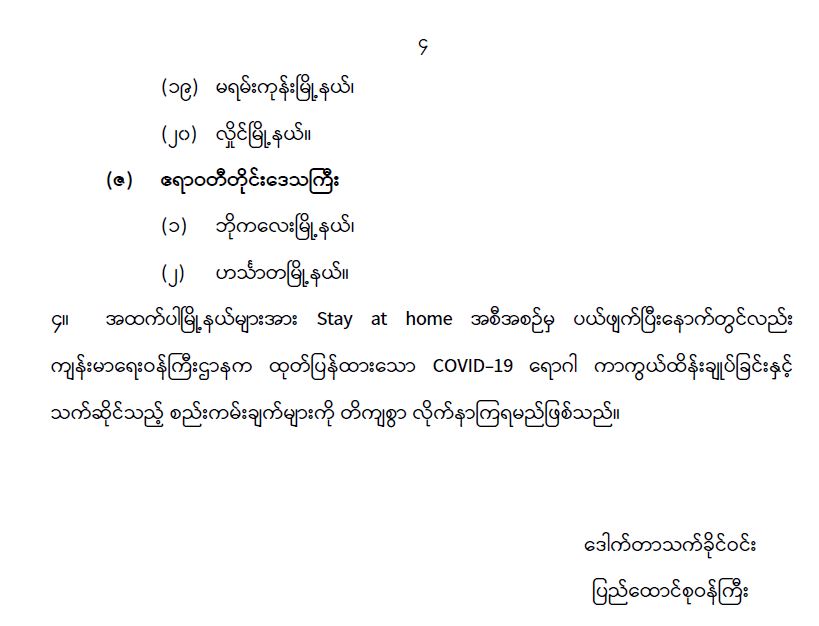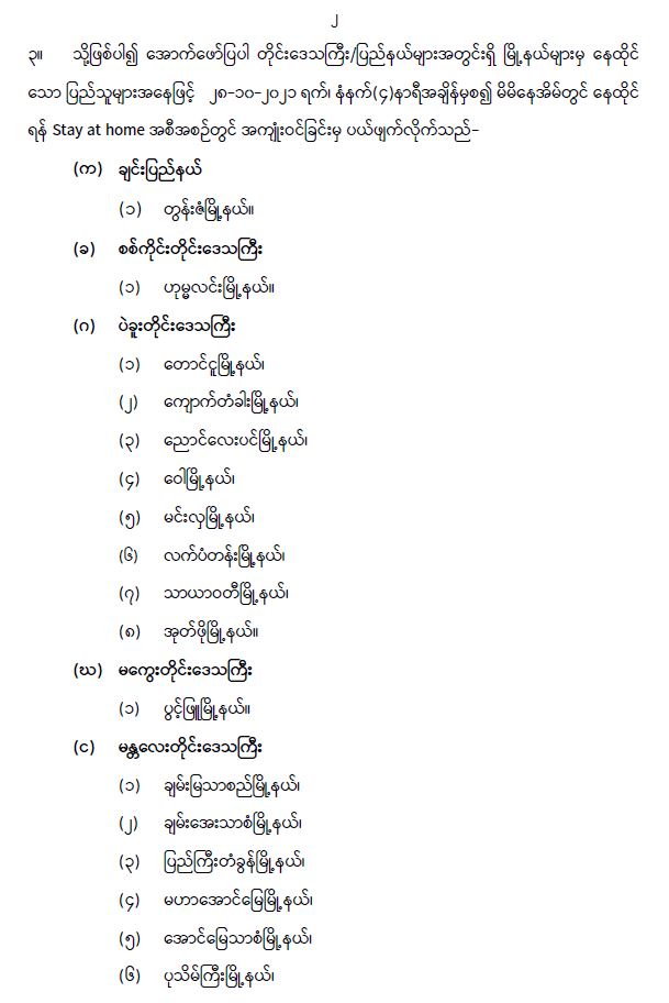 တိုင်းဒေသကြီး/ပြည်နယ်များအတွင်းရှိ ဖော်ပြပါ မြို့နယ် ၄၄ မြို့နယ်အား Stay at home အစီအစဉ်တွင် အကျုံးဝင်ခြင်းမှ ပယ်ဖျက် 10/27/2021