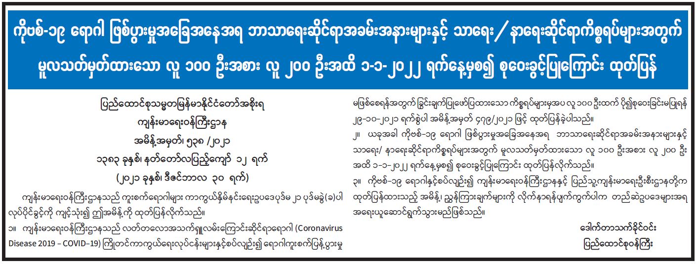 ကိုဗစ်-၁၉ ရောဂါ ဖြစ်ပွားမှုအခြေအနေအရ ဘာသာရေးဆိုင်ရာအခမ်းအနားများနှင့် သာရေး/နာရေးဆိုင်ရာကိစ္စရပ်များအတွက် မူလသတ်မှတ်ထားသော လူ ၁၀၀ ဦးအစား လူ ၂၀၀ ဦးအထိ ၁-၁-၂၀၂၂ ရက်နေ့မှစ၍ စုဝေးခွင့်ပြုကြောင်း ထုတ်ပြန်
