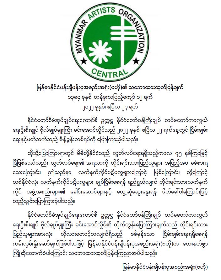 နိုင်ငံတော်စီမံအုပ်ချုပ်ရေးကောင်စီဥက္ကဋ္ဌ နိုင်ငံတော်ဝန်ကြီးချုပ် ဗိုလ်ချုပ်မှူးကြီး မင်းအောင်လှိုင်၏ ငြိမ်းချမ်းရေး ဖိတ်ခေါ်ကမ်းလှမ်းချက်အား မြန်မာနိုင်ငံပန်းချီပန်းပုအစည်းအရုံး (ဗဟို) က ကြိုဆိုထောက်ခံကြောင်း သဘောထားထုတ်ပြန်