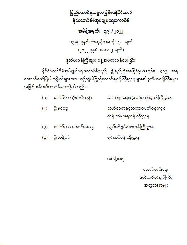 ဒုတိယဝန်ကြီးများ ခန့်အပ်ပေးခြင်း