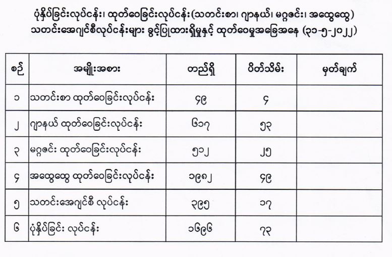 ပုံနှိပ်ခြင်းလုပ်ငန်း၊ ထုတ်ဝေခြင်းလုပ်ငန်း (သတင်းစာ၊ ဂျာနယ်၊ မဂ္ဂဇင်း၊ အထွေထွေ) သတင်းအေဂျင်စီလုပ်ငန်းများ ခွင့်ပြုထားရှိမှုနှင့် ထုတ်ဝေမှုအခြေအနေ (၃၁-၅-၂၀၂၂) 06/06/2022