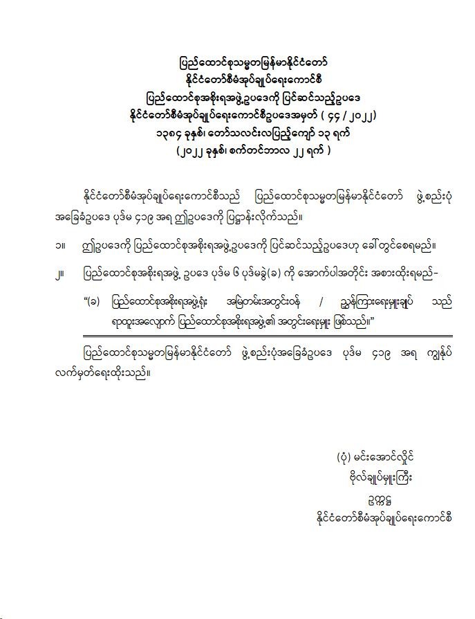 ပြည်ထောင်စုသမ္မတမြန်မာနိုင်ငံတော် နိုင်ငံတော်စီမံအုပ်ချုပ်ရေးကောင်စီ ပြည်ထောင်စုအစိုးရအဖွဲ့ ဥပဒေကို ပြင်ဆင်သည့်ဥပဒေ 09/22/2022