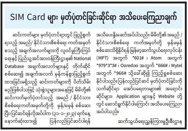 SIM Card များ မှတ်ပုံတင်ခြင်းဆိုင်ရာ အသိပေးကြေညာချက် 11/03/2022 SIM Card များ မှတ်ပုံတင်ခြင်းဆိုင်ရာ အသိပေးကြေညာချက်