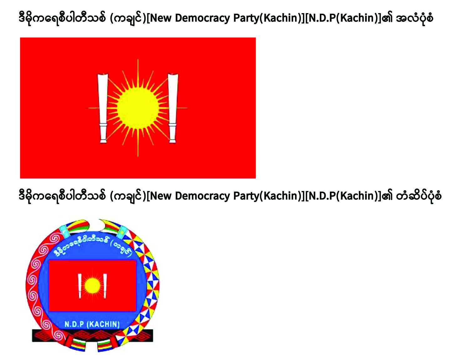 ၁။ ကချင်ပြည်နယ်၊ ချီဖွေခရိုင်၊ ချီဖွေမြို့နယ်၊ ပန်ဝါမြို့၊ ချန်းမောအိမ်ရာ(၁၇)၊ အမှတ်(၃) ရပ်ကွက်တွင် ပါတီရုံးချုပ်တည်ရှိသော ဒီမိုကရေစီပါတီသစ်(ကချင်) [New Democracy Party (Kachin)][N.D.P(Kachin)] က နိုင်ငံရေးပါတီများမှတ်ပုံတင်ခြင်းဥပဒေ ပုဒ်မ ၂၅ အရ နိုင်ငံရေးပါတီအဖြစ် ဆက်လက်တည်ထောင်မှတ်ပုံတင်ခွင့်ပြုရန် ၂၂-၂-၂၀၂၃ ရက်နေ့တွင် လျှောက်ထားလာပါသည်။ ယင်းသို့ လျှောက်ထားရာတွင် ပါတီအမည်၊ အလံနှင့် တံဆိပ်တို့ကို ဖော်ပြပါအတိုင်း အသုံးပြုမည်ဖြစ်ကြောင်း တင်ပြလာပါသည်။