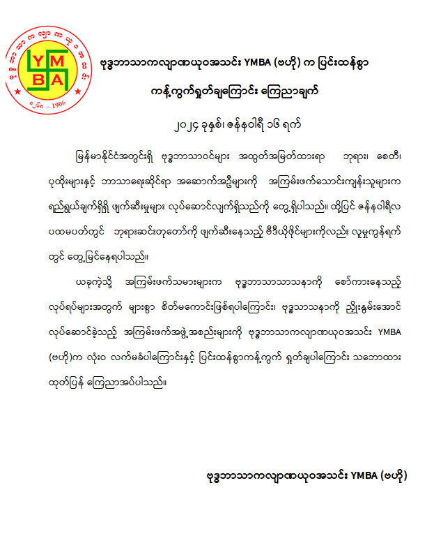 ယခုကဲ့သို့ အကြမ်းဖက်သမားများက ဗုဒ္ဓဘာသာသာသနာကို စော်ကားနေသည့် လုပ်ရပ်များအတွက်များစွာ စိတ်မကောင်းဖြစ်ရပါကြောင်း၊ ဗုဒ္ဓသာသနာကို ညှိုးနွမ်းအောင် လုပ်ဆောင်ခဲ့သည့် အကြမ်းဖက်အဖွဲ့အစည်းများကို ဗုဒ္ဓဘာသာကလျာဏယုဝအသင်း YMBA (ဗဟို)က လုံးဝလက်မခံပါကြောင်းနှင့် ပြင်းထန်စွာကန့်ကွက် ရှုတ်ချပါကြောင်း သဘောထား ထုတ်ပြန်ကြေညာအပ်ပါသည်။