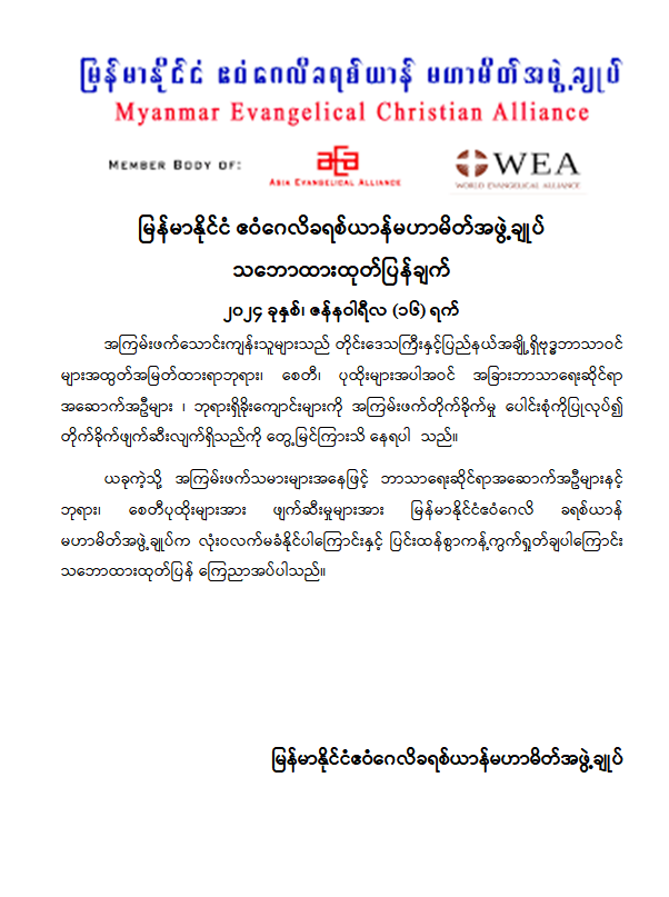 ယခုကဲ့သို့ အကြမ်းဖက်သမားများအနေဖြင့် ဘာသာရေးဆိုင်ရာအဆောက်အဦများနင့် ဘုရား၊ စေတီပုထိုးများအား ဖျက်ဆီးမှုများအား မြန်မာနိုင်ငံဧဝံဂေလိ ခရစ်ယာန် မဟာမိတ်အဖွဲ့ချုပ်က လုံးဝလက်မခံနိုင်ပါကြောင်းနှင့် ပြင်းထန်စွာကန့်ကွက်ရှုတ်ချပါကြောင်း သဘောထားထုတ်ပြန် ကြေညာအပ်ပါသည်။