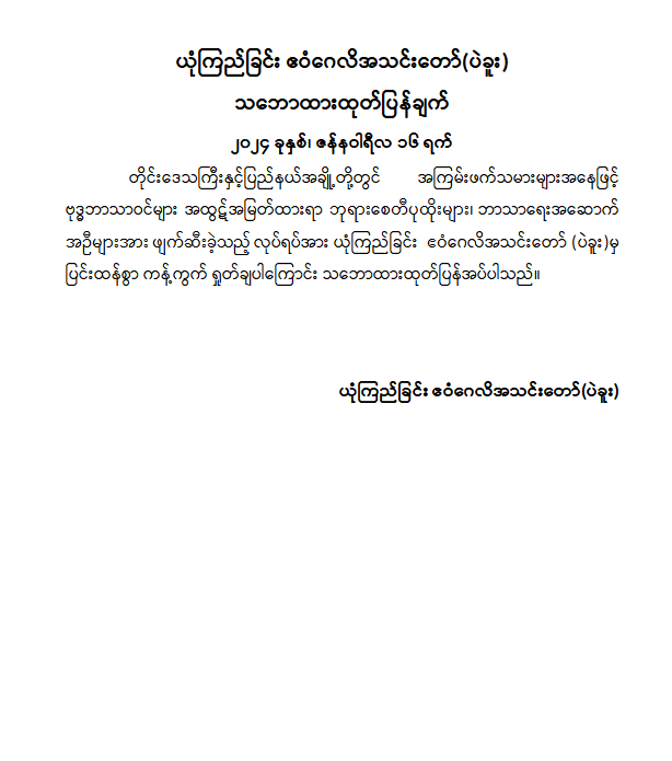 တိုင်းဒေသကြီးနှင့် ပြည်နယ်အချို့တို့တွင် အကြမ်းသမားများအနေဖြင့် ဗုဒ္ဓဘာသာဝင်များအထွတ်အမြတ်ထားရာ ဘုရားစေတီပုထိုးများ၊ ဘာသာရေးအဆောက် အဦများအားဖျက်ဆီးခဲ့သည့် လုပ်ရပ်အား ယုံကြည်ခြင်း ဧဝံဂေလိအသင်းတော်(ပဲခူး)က ပြင်းထန်စွာကန့်ကွက်ရှုတ်ချပါကြောင်း သဘောထားထုတ်ပြန်အပ်ပါသည်။