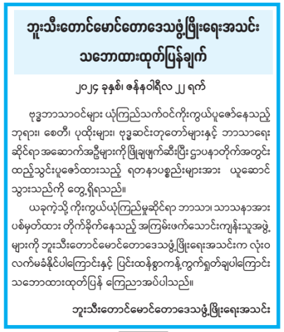 ယခုကဲ့သို့ ကိုးကွယ်ယုံကြည်မှုဆိုင်ရာ ဘာသာ၊ သာသနာအား ပစ်မှတ်ထား တိုက်ခိုက်နေသည့် အကြမ်းဖက်သောင်းကျန်းသူအဖွဲ့ များကို ဘူးသီးတောင်မောင်တောဒေသဖွံ့ဖြိုးရေးအသင်းက လုံးဝ လက်မခံနိုင်ပါကြောင်းနှင့် ပြင်းထန်စွာကန့်ကွက်ရှုတ်ချပါကြောင်း သဘောထားထုတ်ပြန် ကြေညာအပ်ပါသည်။