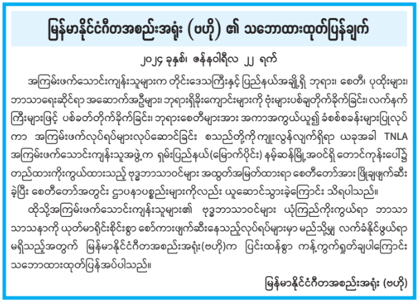 ထိုသို့အကြမ်းဖက်သောင်းကျန်းသူများ၏ ဗုဒ္ဓဘာသာဝင်များ ယုံကြည်ကိုးကွယ်ရာ ဘာသာ သာသနာကို ယုတ်မာရိုင်းစိုင်းစွာ စော်ကားဖျက်ဆီးနေသည့်လုပ်ရပ်များမှာ မည်သို့မျှ လက်ခံနိုင်ဖွယ်ရာ မရှိသည့်အတွက် မြန်မာနိုင်ငံဂီတအစည်းအရုံး(ဗဟို)က ပြင်းထန်စွာ ကန့်ကွက်ရှုတ်ချပါကြောင်း သဘောထားထုတ်ပြန်အပ်ပါသည်။
