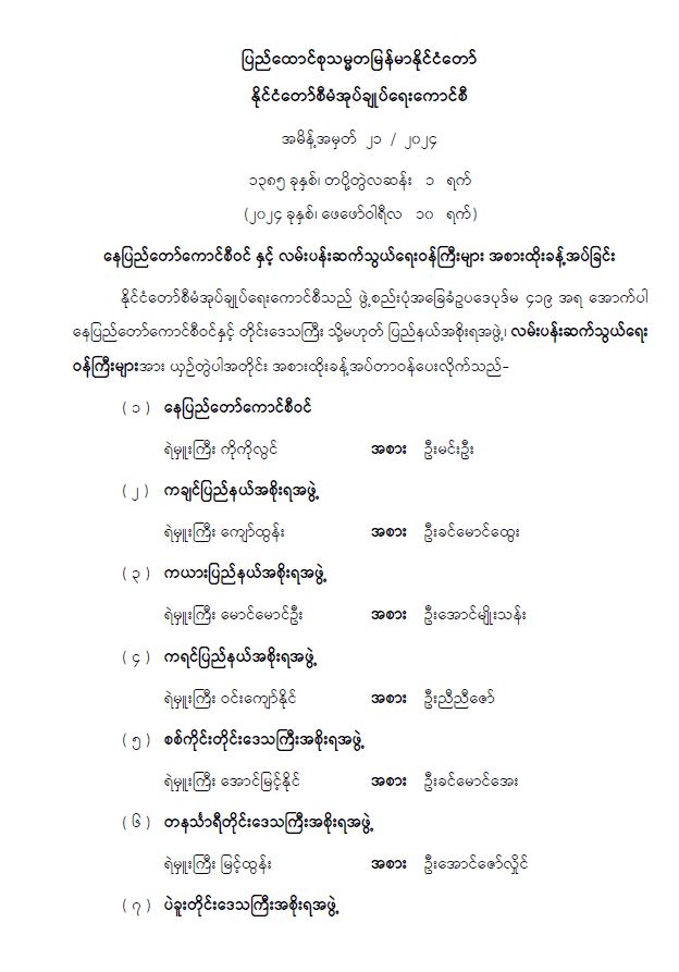 နေပြည်တော်ကောင်စီဝင်နှင့် လမ်းပန်းဆက်သွယ်ရေးဝန်ကြီးများ အစားထိုးခန့်အပ်ခြင်း