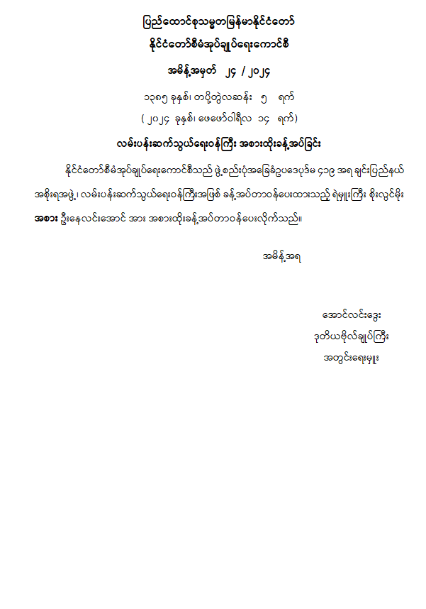 လမ်းပန်းဆက်သွယ်ရေးဝန်ကြီး အစားထိုးခန့်အပ်ခြင်း 02/15/2024 လမ်းပန်းဆက်သွယ်ရေးဝန်ကြီး အစားထိုးခန့်အပ်ခြင်း
