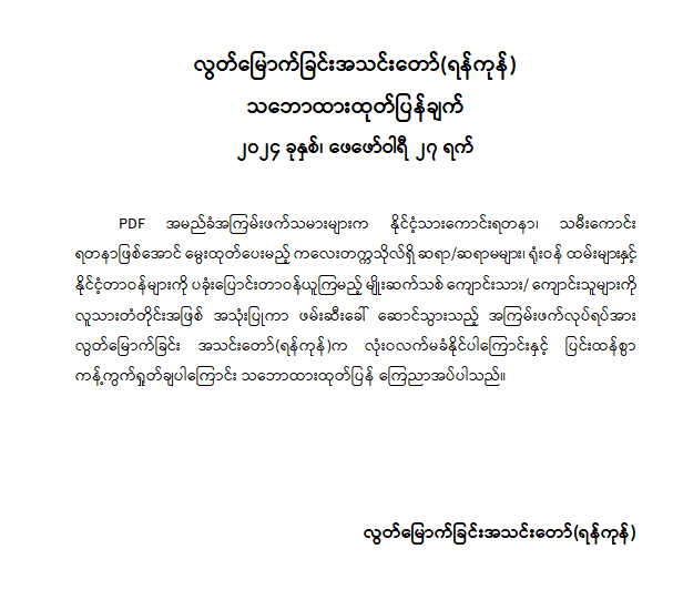 လွတ်မြောက်ခြင်းအသင်းတော် (ရန်ကုန်) သဘောထားထုတ်ပြန်ချက်
