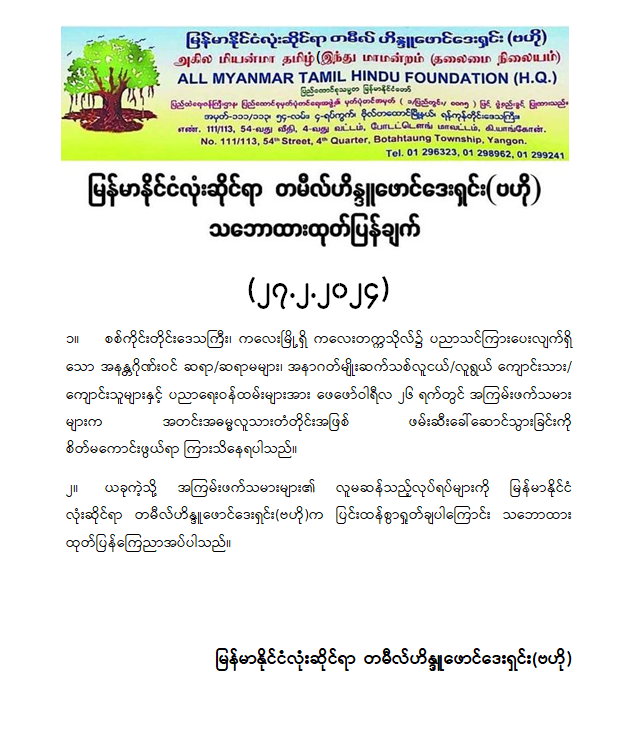 မြန်မာနိုင်ငံလုံးဆိုင်ရာ တမီလ်ဟိန္ဒူဖောင်ဒေးရှင်း (ဗဟို) သဘောထားထုတ်ပြန်ချက်