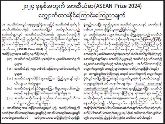 ၂၀၂၄ ခုနှစ်အတွက် အာဆီယံဆု (ASEAN Prize 2024) လျှောက်ထားနိုင်ကြောင်းကြေညာချက်