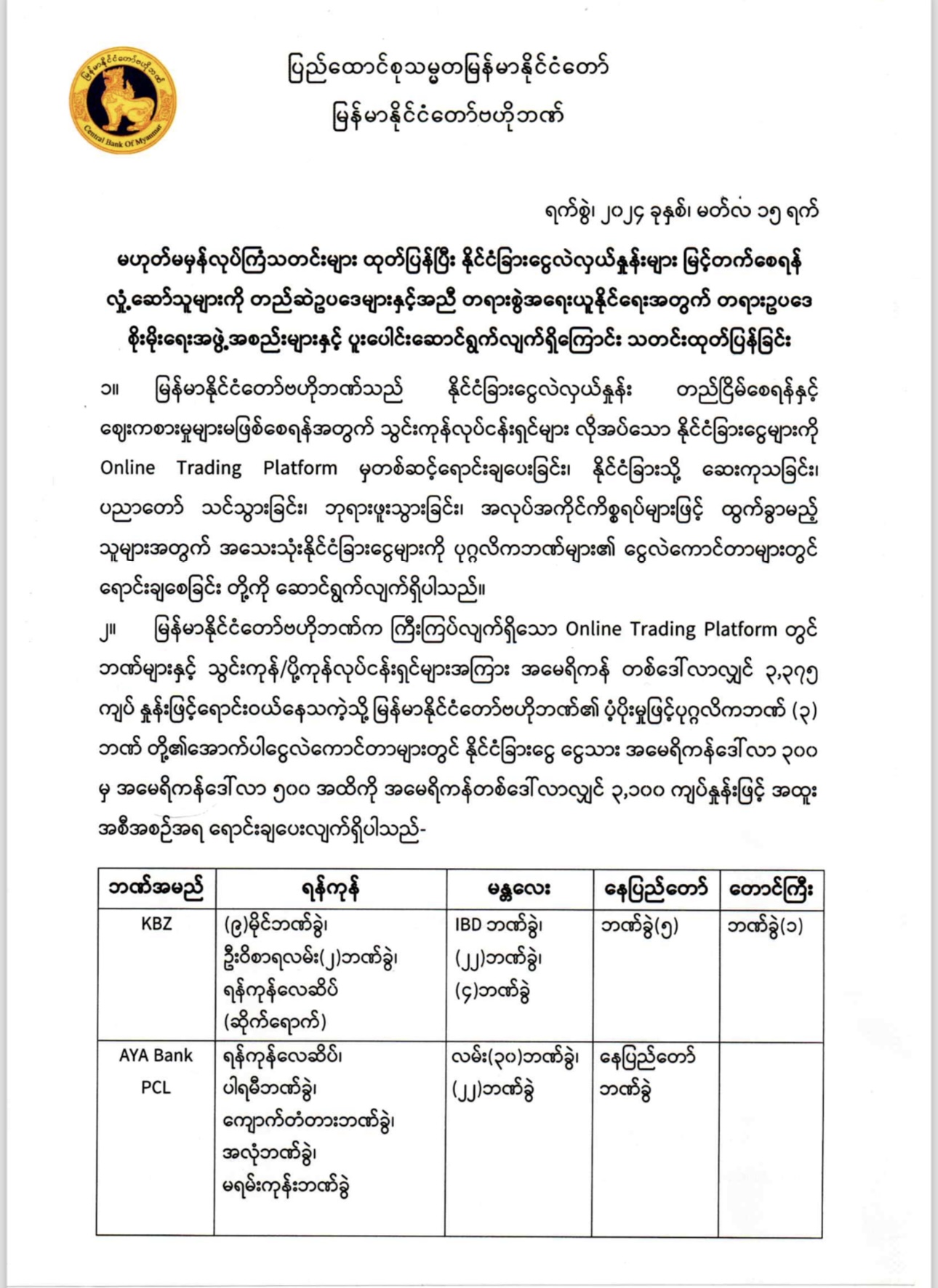 မဟုတ်မမှန်လုပ်ကြံသတင်းများ ထုတ်ပြန်ပြီး နိုင်ငံခြားငွေလဲလှယ်နှုန်းများ မြင့်တက်စေရန် လှုံ့ဆော်သူများကို တည်ဆဲဥပဒေများနှင့်အညီ တရားစွဲအရေးယူနိုင်ရေးအတွက် တရားဥပဒေ စိုးမိုးရေးအဖွဲ့အစည်းများနှင့် ပူးပေါင်းဆောင်ရွက်လျက်ရှိကြောင်း သတင်းထုတ်ပြန်ခြင်း