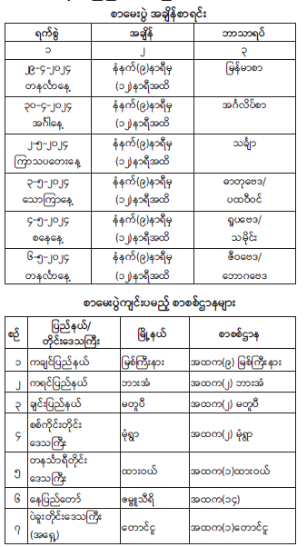 ၂။ အဆိုပါ အထူးအစီအစဉ်တစ်ရပ်အနေဖြင့် ကျင်းပဆောင်ရွက်မည့် တက္ကသိုလ်ဝင်စာမေးပွဲ အချိန်စာရင်းနှင့် စာစစ်ဌာနများစာရင်းကို အောက်ပါအတိုင်း ကြေညာအပ်ပါသည်