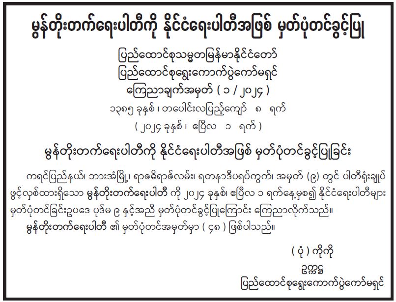 မွန်တိုးတက်ရေးပါတီကို နိုင်ငံရေးပါတီအဖြစ် မှတ်ပုံတင်ခွင့်ပြု