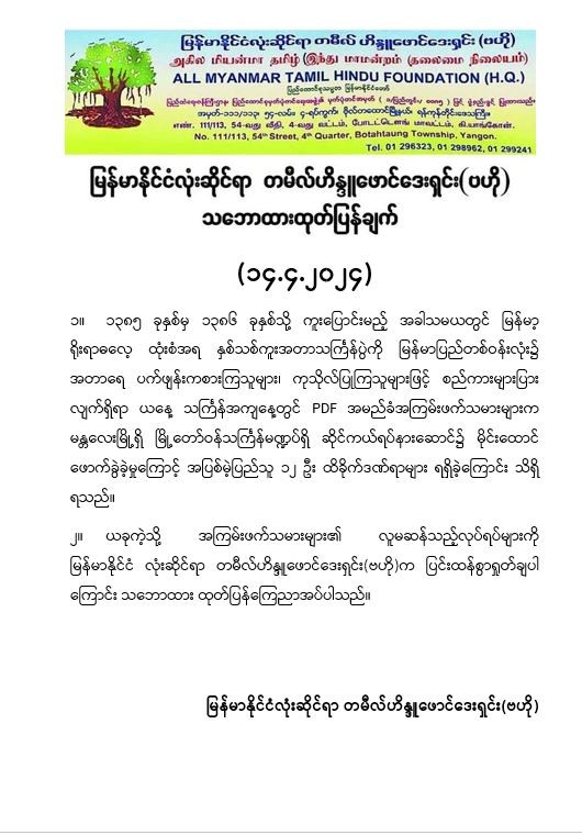 မြန်မာနိုင်ငံလုံးဆိုင်ရာ တမီလ်ဟိန္ဒူဖောင်ဒေးရှင်း(ဗဟို) သဘောထားထုတ်ပြန်ချက်