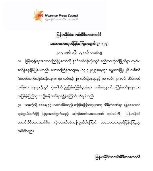 မြန်မာနိုင်ငံ သတင်းမီဒီယာကောင်စီ သဘောထားထုတ်ပြန်ကြေညာချက် (၃/၂၀၂၄)