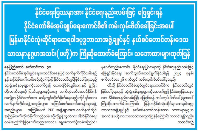 နိုင်ငံရေးပြဿနာအား နိုင်ငံရေးနည်းလမ်းဖြင့်ဖြေရှင်းရန် နိုင်ငံတော်စီမံအုပ်ချုပ်ရေးကောင်စီ၏ ကမ်းလှမ်းဖိတ်ခေါ်ခြင်းအပေါ် မြန်မာနိုင်ငံလုံးဆိုင်ရာ ထေရဝါဒဗုဒ္ဓဘာသာအဖွဲ့ချုပ်နှင့် နယ်စပ်တောင်တန်းဒေသ သာသနာနုဂ္ဂဟအသင်း (ဗဟို) က ကြိုဆိုထောက်ခံကြောင်း သဘောထားများထုတ်ပြန်