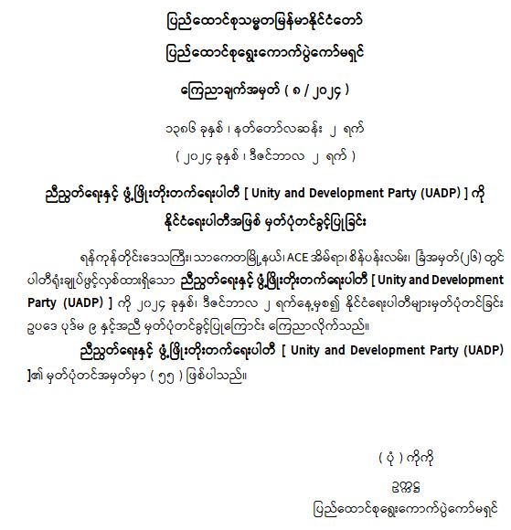 ညီညွတ်ရေးနှင့် ဖွံ့ဖြိုးတိုးတက်ရေးပါတီ [ Unity and Development Party (UADP) ] ကို နိုင်ငံရေးပါတီအဖြစ် မှတ်ပုံတင်ခွင့်ပြုခြင်း 12/02/2024