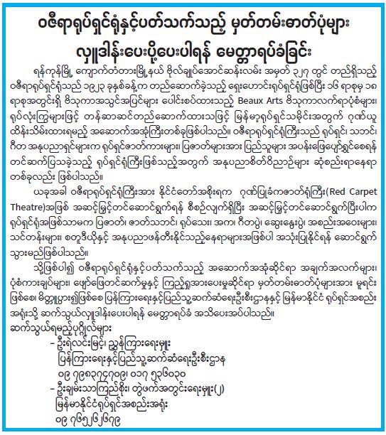 သို့ဖြစ်ပါ၍ ဝဇီရာရုပ်ရှင်ရုံနှင့်ပတ်သက်သည့် အဆောက်အအုံဆိုင်ရာ အချက်အလက်များ၊ ပုံစံကားချပ်များ၊ ဖျော်ဖြေတင်ဆက်မှုနှင့် ကြည့်ရှုအားပေးမှုဆိုင်ရာ မှတ်တမ်းဓာတ်ပုံများအား မူရင်းဖြစ်စေ၊ မိတ္တူပွား၍ဖြစ်စေ ပြန်ကြားရေးနှင့်ပြည်သူ့ဆက်ဆံရေးဦးစီးဌာနနှင့် မြန်မာနိုင်ငံရုပ်ရှင်အစည်းအရုံးသို့ ဆက်သွယ်လှူဒါန်းပေးပါရန် မေတ္တာရပ်ခံအသိပေးအပ်ပါသည်။