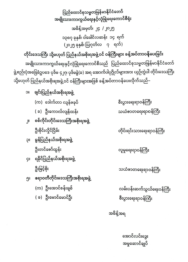 တိုင်းဒေသကြီး သို့မဟုတ် ပြည်နယ်အစိုးရအဖွဲ့ဝင် ဝန်ကြီးများ ခန့်အပ်တာဝန်ပေးခြင်း