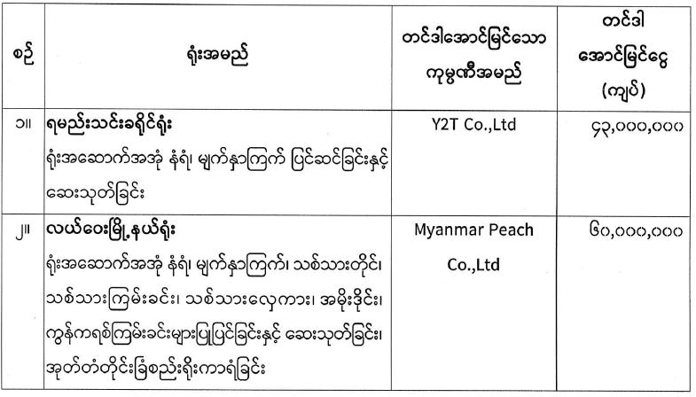 ပြန်ကြားရေးဝန်ကြီးဌာန၊ ပြန်ကြားရေးနှင့်ပြည်သူ့ဆက်ဆံရေးဦးစီးဌာန၏ ၂၀၂၅-၂၀၂၆ ဘဏ္ဍာရေးနှစ် ငွေလုံးငွေရင်းအသုံးစရိတ်ဖြင့် မန္တလေးငလျင်ကြီးကြောင့် ထိခိုက်ပျက်စီးခဲ့သည့် ရမည်းသင်းခရိုင်ရုံးနှင့် လယ်ဝေးမြို့နယ်ရုံး အဆောက်အအုံများ ပြင်ဆင်နိုင်ရေးအတွက် ၁၄-၈-၂၀၂၅ ရက်နေ့၌ ပြန်ကြားရေးဝန်ကြီးဌာန၊ ဝန်ကြီးရုံး စုပေါင်းခန်းမတွင် တင်ဒါကော်မတီ၏ စျေးနှုန်းစိစစ်ချက်အရလည်းကောင်း၊ ၁-၉-၂၀၂၅ ရက်နေ့တွင် ကျင်းပပြုလုပ်သော ပြန်ကြားရေးဝန်ကြီးဌာန၊ စီမံခန့်ခွဲရေးကော်မတီအစည်းအဝေး အမှတ်စဉ် (၁၂/ ၂၀၂၅)၏ သဘောတူညီချက်အရလည်းကောင်း အောက်ဖော်ပြပါကုမ္ပဏီများမှ ယှဉ်တွဲပါ ဈေးနှုန်းဖြင့် တင်ဒါအောင်မြင်ကြောင်း ကြေညာအပ်ပါသည်-