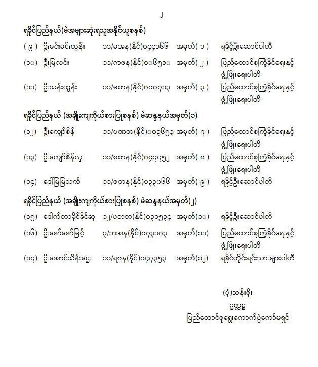 အမျိုးသားလွှတ်တော်ကိုယ်စားလှယ်အဖြစ် ရွေးကောက်တင်မြှောက်ခံရသူများ အမည်စာရင်းကြေညာခြင်း