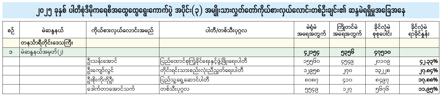 ၂၀၂၅ ခုနှစ် ပါတီစုံဒီမိုကရေစီအထွေထွေရွေးကောက်ပွဲ အပိုင်း(၃) အမျိုးသားလွှတ်တော်ကိုယ်စားလှယ်လောင်းတစ်ဦးချင်း၏ ဆန္ဒမဲရရှိမှုအခြေအနေ