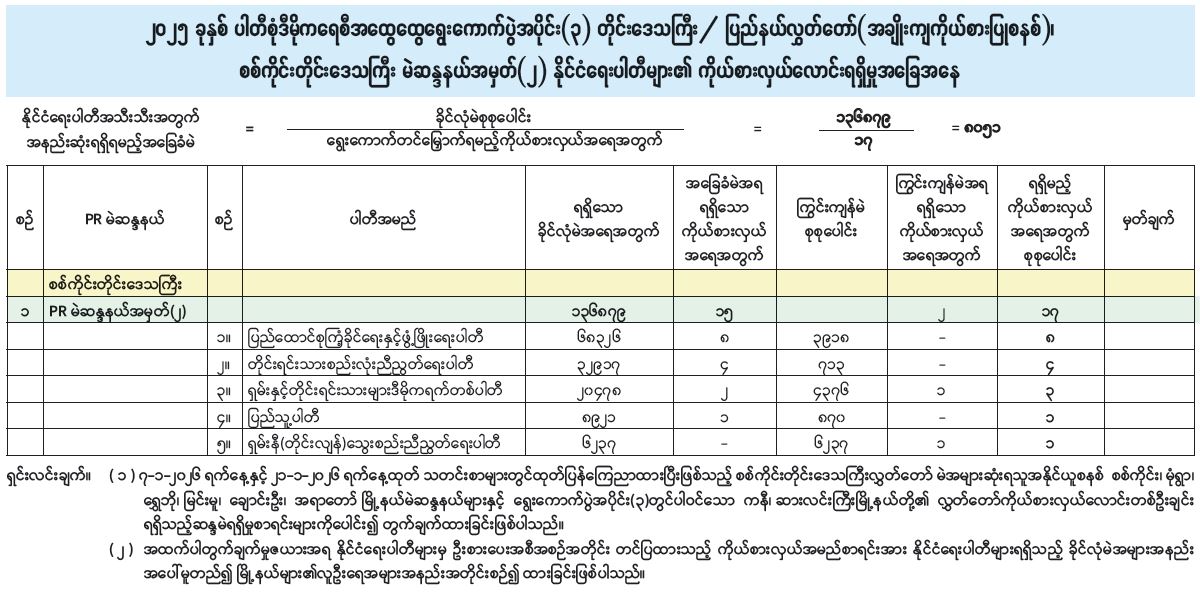 ၂၀၂၅ ခုနှစ် ပါတီစုံဒီမိုကရေစီအထွေထွေရွေးကောက်ပွဲအပိုင်း (၃) တိုင်းဒေသကြီး/ ပြည်နယ်လွှတ်တော် (အချိုးကျကိုယ်စားပြုစနစ်)၊ စစ်ကိုင်းတိုင်းဒေသကြီး မဲဆန္ဒနယ်အမှတ် (၂) နိုင်ငံရေးပါတီများ၏ ကိုယ်စားလှယ်လောင်းရရှိမှုအခြေအနေ 01/31/2026