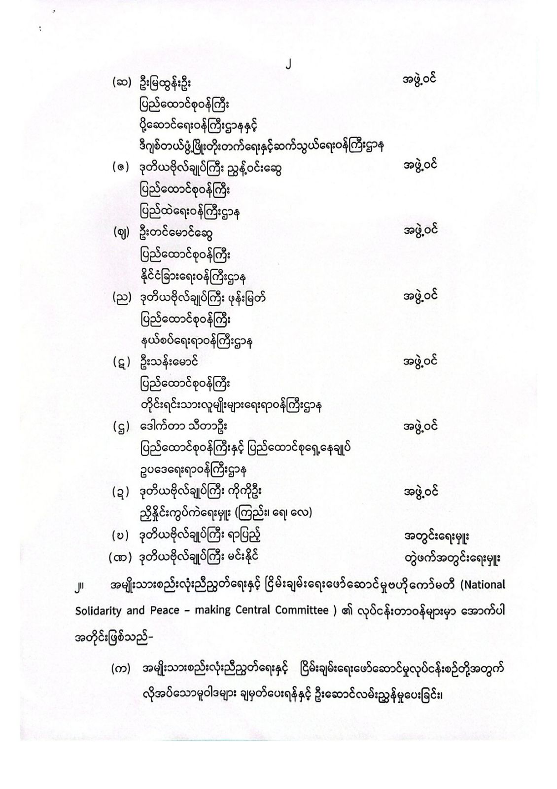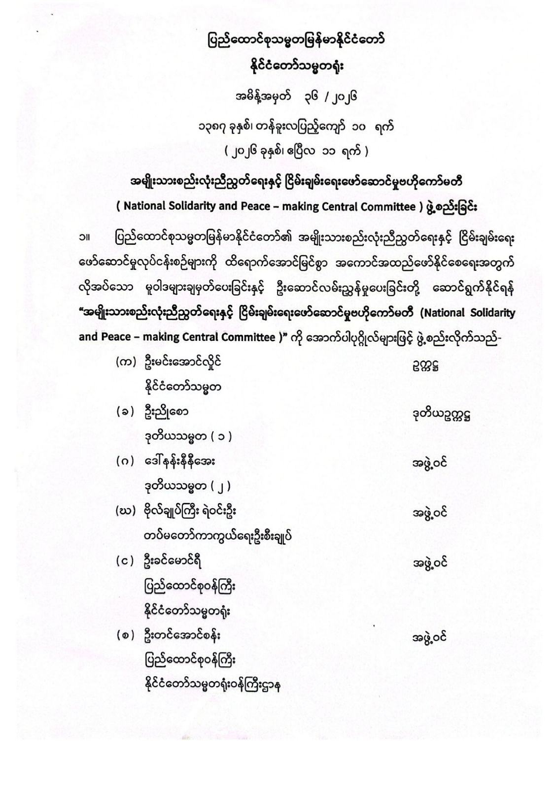 အမျိုးသားစည်းလုံးညီညွတ်ရေးနှင့် ငြိမ်းချမ်းရေးဖော်ဆောင်မှုဗဟိုကော်မတီ (National Solidarity and Peace – making Central Committee) ဖွဲ့စည်းခြင်း 04/12/2026