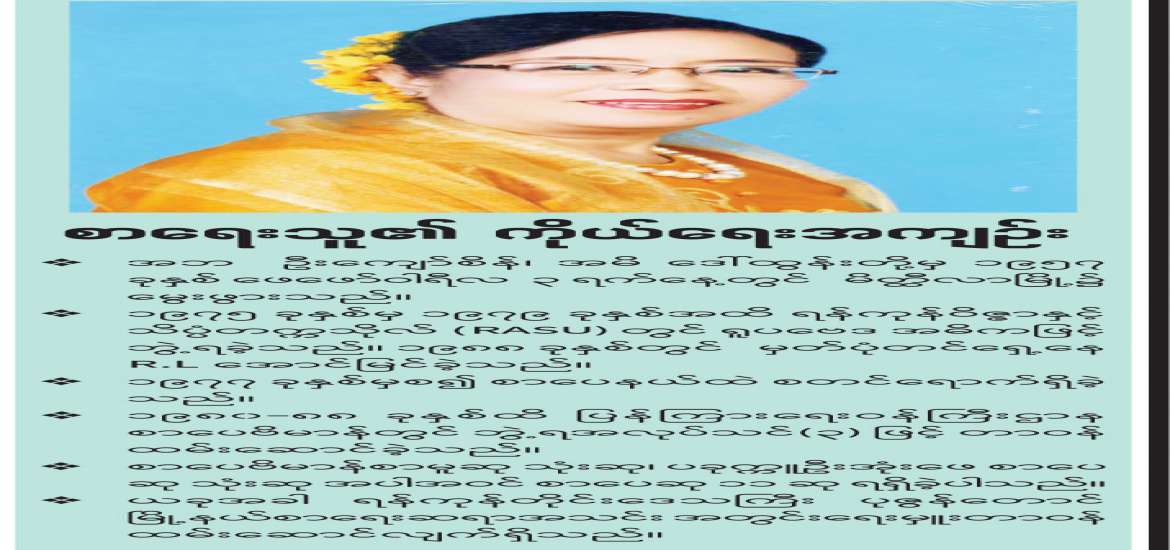 လွန်ခဲ့တဲ့ နှစ်ပေါင်း ၄၀ က ရန်ကုန်တက္ကသိုလ် ပန်းချီခန်းမမှာ ပန်းချီပညာသင်ယူခဲ့တာ ဂုဏ်ယူမဆုံး ဖြစ်ရပါတယ်။ အမိရန်ကုန်တက္ကသိုလ်ကြီးက စာပေ၊ ဂီတ၊ အနုပညာသာမက အားကစား ထူးချွန်သူများ၊ နိုင်ငံ့ ခေါင်းဆောင်များစွာကိုလည်း မွေးထုတ်ပေးခဲ့တာ တကယ် ဂုဏ်ယူစရာပါ။ ကျွန်မတို့လို ရန်ကုန်တက္ကသိုလ် ကျောင်း သား ကျောင်းသူဟောင်းတွေအနေနဲ့ အမိတက္ကသိုလ်အတွက် ရင်ထဲက ဂုဏ်ပြုနေတာ ၂၀၂၀ ပြည့်နှစ် တစ်နှစ်လုံးပဲ ဖြစ်ပါတယ်။ ရန်ကုန်တက္ကသိုလ် ပရဝဏ်မှာ ရာပြည့် အခမ်းအနားကို ကိုဗစ်-၁၉ ကြောင့် မကျင်းပရပေမယ့် ကျွန်မတို့အားလုံးရင်ထဲမှာ အမိတက္ကသိုလ်ရဲ့ ရာပြည့် မွေးနေ့အတွက် စိတ်ကူးပုံဖော်ပြီး ပြုံးရိပ်ပျော်ရင်း အတွေးနဲ့ ဂုဏ်ပြုနေကြပါတယ်ဆိုတဲ့အကြောင်း ရန်ကုန်တက္ကသိုလ် ကျောင်းသား ကျောင်းသူတွေ ကိုယ်စား ဆန္ဒကို ဖွင့်လှစ်ပြလိုက်ပါရတယ်။ ။