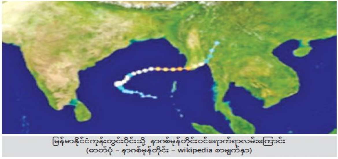 မြန်မာနိုင်ငံနှင့် နာဂစ်မုန်တိုင်း ဧရိယာအကျယ်အဝန်း ၂၆၁၂၂၈ စတုရန်းမိုင် (၆၇၆၅၇၈ စတုရန်းကီလိုမီတာ) ကျယ်ဝန်းသော မြန်မာနိုင်ငံသည် အရှေ့တောင်အာရှတွင် ကုန်းမြေ ဧရိယာ ဒုတိယအကြီးမားဆုံးဖြစ်ပြီး မြေပြင် တစ်ဆက်တည်းအကျယ်အဝန်းအရ အကြီးမားဆုံး နိုင်ငံဖြစ်ပါသည်။ ကမ္ဘာပေါ်တွင် အမှတ်စဉ် (၄၀)မြောက် အကြီးဆုံးနိုင်ငံလည်းဖြစ်၍ ကုန်းမြေ ဧရိယာကြီးမားကျယ်ပြန့်သကဲ့သို့ နိုင်ငံပတ်ပတ် လည် နယ်နိမိတ်တစ်ခုလုံး၏ သုံးပုံတစ်ပုံရှိသော ပင်လယ်ကမ်းရိုးတန်းအလျားမှာ ရခိုင် ပြည်နယ် နတ်မြစ်ဝမှတနင်္သာရီတိုင်းဒေသကြီးကော့သောင်း အထိ ၁၁၉၉ မိုင် (၁၉၃၀ ကီလို မီတာ) (ရေမိုင် နယ်နိမိတ် ၁၃၈၅ မိုင်) ရှည်လျားပါသည်။ ဥတ္တရယဉ်စွန်းတန်းနှင့် အီကွေတာအကြား တည်ရှိပြီး အာရှတိုက်၏ မုတ်သုံရပ်ဝန်းအတွင်း ကျရောက်လျက်ရှိသည့် မြန်မာနိုင်ငံ၏ရာသီဥတု မှာ အပူပိုင်းမုတ်သုံရာသီဥတု ဖြစ်သည်။ နိုင်ငံ၏ အနောက်တောင်ဘက်နှင့် တောင်ဘက်ရှိ ဘင်္ဂလား ပင်လယ်အော်နှင့် ကပ္ပလီ ပင်လယ်တို့မှ တိုက်ခတ် သော လေကြောင်းနှင့် လေဖိအားအခြေအနေများ ကြောင့် မိုးရွာသွန်းမှုကို ဖြစ်ပေါ်စေသည့်အပြင် အချို့ နှစ်များတွင် မုန်တိုင်းများ ပြင်းထန်စွာ ကျရောက်လေ့ရှိရာ ကမ်းရိုးတန်းဒေသများသည် မုန်တိုင်းဒဏ်ကို အများဆုံး ကြုံတွေ့ရလေ့ ရှိသည်။ ဤကဲ့သို့ကျရောက်သော မုန်တိုင်းများအနက် ၂၀၀၈ ခုနှစ် မေလ ၂ ရက်နေ့တွင် တိုက်ခတ်ခဲ့သော နာဂစ်မုန်တိုင်းသည် သမိုင်းတစ်လျှောက် မြန်မာ နိုင်ငံတွင် ပေါ်ပေါက် ကြုံတွေ့ခဲ့ရသော သဘာဝ ဘေးအန္တရာယ်များအနက် အဆိုးရွားဆုံး၊ အကြမ်း တမ်းဆုံးဖြစ်ခဲ့ ပါသည်။ မုန်တိုင်းစတင်မှုနှင့် အဆင့်ဆင့် တိုးတက်မြင့်မားလာမှု ၂၀၀၈ ခုနှစ် ဧပြီလ ၂၇ ရက်နေ့၌ ဘင်္ဂလား ပင်လယ်အော်တွင် စတင်ဖြစ်ပေါ်ခဲ့သော နာဂစ် ဟု အမည်သတ်မှတ်ထားသည့် မုန်တိုင်းတစ်ခုသည် ဧပြီလ ၂၈ ရက်နေ့ ကမ္ဘာ့လေထုထဲ၌ ယင်း၏ လေဖိအားကြီးရာရပ်ဝန်း အနောက်မြောက်နှင့် အရှေ့တောင်အကြား ရှိနေစဉ်အတွင်း ငြိမ်သက် လု နီးပါးရှိနေခဲ့သည်။ ထိုနေ့တွင် JTWC (Joint Typhoon Warning Center) Soodu? အဆိုပါ မုန်တိုင်းကို လေပြင်းမုန်တိုင်းအဆင့်မှ ဆိုင်ကလုန်း အဆင့်သို့ တိုးမြှင့်သတ်မှတ်ခဲ့ပြီး IMD (India Meteorological Department) လည်း လေပွေလေပြင်းမုန်တိုင်းအကြီးစားတစ်ခု အဖြစ် သတ်မှတ်ခဲ့သည်။ ထိုသို့သတ်မှတ်ခဲ့စဉ် မုန်တိုင်းအဆင့်သည် ဆာဖာ - ဆင်မ်ဆန် ဟာရီ 8&cocos (Saffir-Simpson hurricane scaleSSHS) အရ အသေးငယ်ဆုံး ဟာရီကိန်းအဆင့်သို့ ရောက်ရှိနေခဲ့ပြီဖြစ်သည်။ ဧပြီလ ၂၉ ရက်နေ့ အစောပိုင်း၌ JTWC က နာဂစ်မုန်တိုင်း၏ လေတိုက်ခတ်နှုန်းမှာ တစ် နာရီလျှင် ကီလိုမီတာ ၁၆ဝ (၁နာရီလျှင် မိုင် ၁၀၀) နှုန်းရှိမည်ဟုခန့်မှန်းခဲ့ပြီး တစ်ချိန်တည်းတွင် IMD ကလည်း အလွန်ပြင်းအားကြီးမည့် လေပွေမ