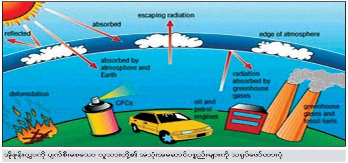 မှန်လုံအိမ်အာနိသင်ရှိသည့် အိုဇုန်းလွှာကို ပျက်စီးစေသော ဒြပ်ပစ္စည်းများကို လျှော့ချသုံးစွဲခြင်း၊ စနစ်တကျ သုံးစွဲခြင်းဖြင့် အိုဇုန်းလွှာ ထိခိုက်ပျက်စီးမှုနှင့် ရာသီဥတု ပြောင်းလဲခြင်းတို့ကို လျှော့ချ ကာကွယ်ပါ။ ။