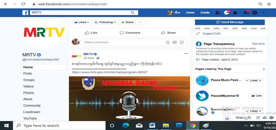 MRTV Facebook page စာမျက်နှာသည် မြန်မာ့အသံနှင့် ရုပ်မြင်သံကြားဌာန တစ်ခုလုံးကို ကိုယ်စားပြုပြီး ရုပ်သံလိုင်းများနှင့် ရေဒီယိုလိုင်းများမှ ထုတ်လွှင့် သည့် သတင်းနှင့် အစီအစဉ် များကို လွှင့်တင်ပေး လျက်ရှိသည်။ လူငယ်များအတွက် စိတ်ဝင်စားစေမည့် ဘောလုံးပွဲ တိုက်ရိုက်ပြသမှုများ၊ နာရီစဉ် သတင်းများနှင့် နိုင်ငံတကာသတင်းများကို တိုက်ရိုက်လွှင့် တင်ပေးခဲ့ရာမှ ပိုမိုအဆင်ပြေစေရန်အတွက် MRTV-LIVE Page မှ တိုက်ရိုက်တင်ဆက်မှုများကို ဝင်ရောက် ကြည့်ရှုနိုင်သည်။