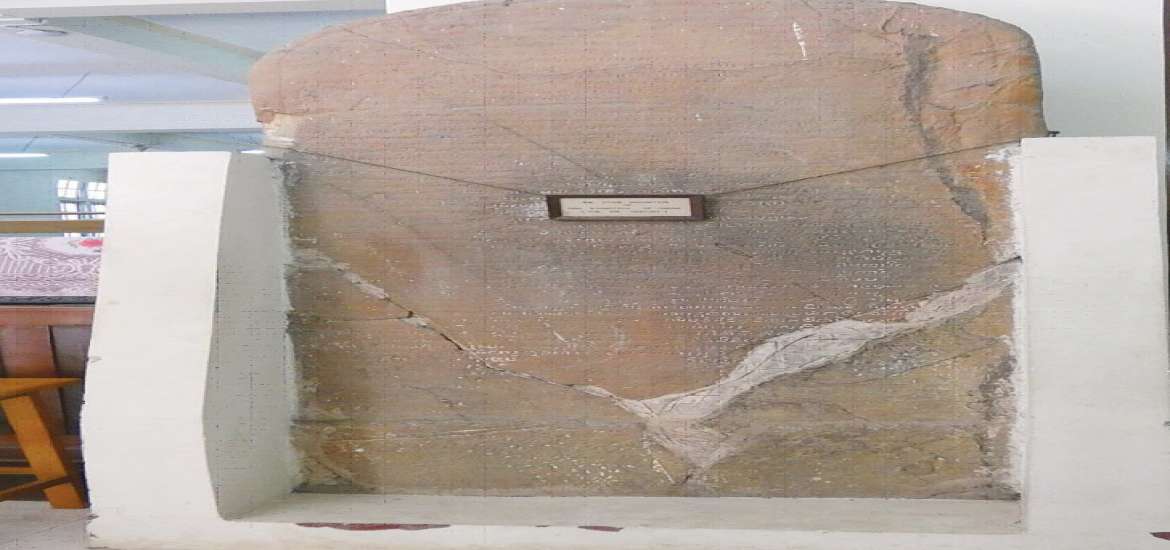 ထို့ပြင် ရန်ကုန်တက္ကသိုလ်စာကြည့်တိုက်အတွင်း အဝင်ဝတွင် စစ်ဘေးဒဏ်ခံခဲ့ရသည့် အင်္ဂတေကိုင်၍ စိုက်ထူထားသော အမြင့် ၇ ပေကျော်နှင့် အနံ ၃ ပေ ကျော်ရှိသည့် သမိုင်း ဝင် ရှေးဟောင်း ကျောက်စာတိုင်ကြီးတစ်တိုင် ရှိပါသည်။ ယင်းကျောက်စာတိုင်သည် ၁၉၃၀ ပြည့်နှစ် မတိုင်မီက ရန်ကုန်ဆေးရုံကြီး နေရာတွင် တိရစ္ဆာန်ရုံနှင့်အတူ ဖယ်ယာပြတိုက် (Phayre Museum) ရှိခဲ့ပါသည်။ တိရစ္ဆာန်ရုံ ကို ယခုလက်ရှိနေရာသို့ ပြောင်းရွှေ့ခဲ့ပြီး ဖယ်ယာ ပြတိုက်(Phayre Museum) တွင် ထားရှိခဲ့ သော ကျောက်စာတိုင်ကြီးကို အတွင်းဝန်များ ရုံးတွင် ခေတ္တထား ရှိခဲ့ကြောင်း၊ ၁၉၃၃ ခန့် တွင် ရန်ကုန်တက္ကသိုလ် အာဏာပိုင်များက ရန်ကုန်တက္ကသိုလ်စာကြည့်တိုက် အဆောက်အဦသို့ ပြောင်းရွှေ့ သယ်ယူထားရှိခဲ့ကြောင်း သိရပါသည်။