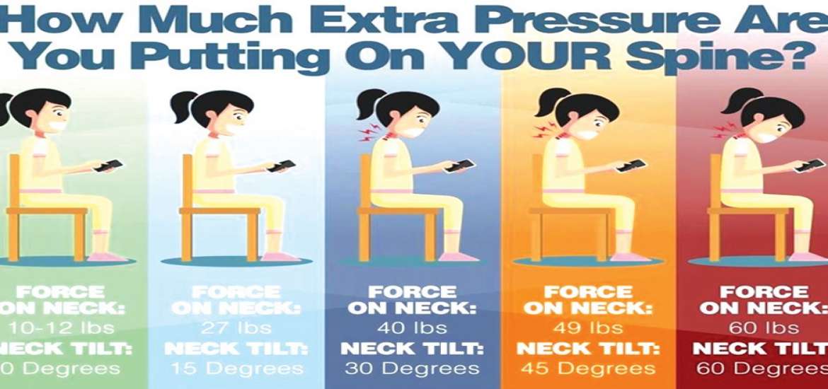 မိုဘိုင်းဖုန်း အသုံးပြုစဉ် ဦးခေါင်းကိုထားရှိသည့် အနေအထားပေါ် မူတည် ၍ လည်ပင်းပိုင်းတွင် ဝန်ပိုလာနိုင်ကြောင်းကို ပုံ (၅) ပါအတိုင်း ပညာရှင်များက ထောက်ပြထားပါသည်။ ဦးခေါင်း ပိုငုံ့လေလေ လည်ပင်းပိုင်းက ဦးခေါင်းကို ထိန်းထားရသည့် အလေးချိန်ပိုလေလေ ဖြစ်လာနိုင်ပါသည်။ ခေါင်းကို အမြဲ အောက်စိုက်ပြီး ဖုန်းကို ငုံ့ကြည့်နေပါက ဇက်ကြောတက်ခြင်း၊ ပခုံး၊ အရိုး အဆစ်များ နာကျင်ကိုက်ခဲခြင်း၊ ကျီးပေါင်းတက်ခြင်း၊ အထိုင်များပြီး လှုပ်ရှားမှု နည်းသည့်အတွက် အရိုးအဆစ်များ ပျော့ခွေလာခြင်း အစရှိသည်တို့ ဖြစ် လာနိုင်ပါသည်။